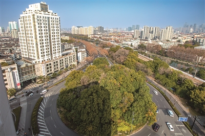 解放路与环城东路交叉口环岛,还保留着金衙庄留下来的古樟树群。