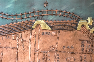 金衙庄公园里的《浙江省城全图》浮雕,标有马坡巷和金衙庄地名。本版摄影 记者 陈中秋