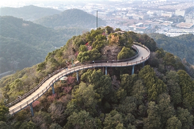 在杭州众多热门登高线路中,有一条马家坞绿道。沿着葱郁的道路上去,山脊之巅矗立着一座观景平台,凭栏而立,可以同时俯瞰西湖和西溪全景。
