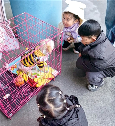 每天早上,豆包在门口迎接孩子们来幼儿园。