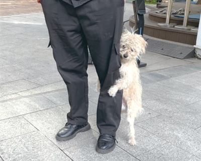 渐渐熟悉后,豆包抱着保安师傅的腿。