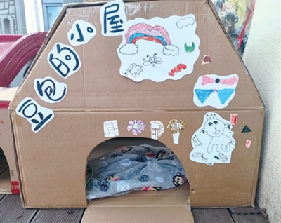孩子们用纸板箱为豆包做的小屋