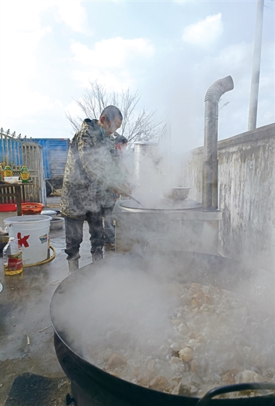 57岁的余国庆为杀年猪忙前忙后,挑着一担担开水往广场送。他说,这钱花得值,这劲使得值。