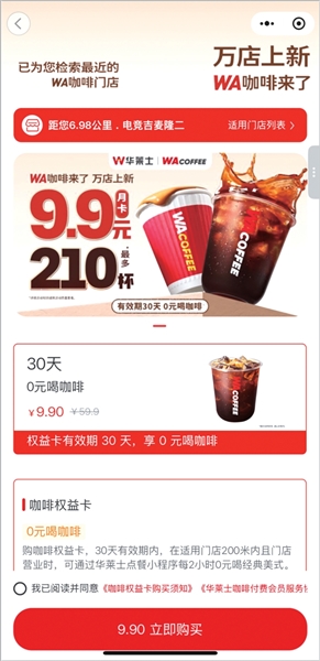 华莱士新推的咖啡月卡,9.9元最多可以买210杯咖啡。