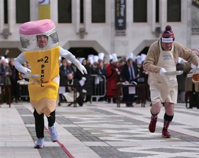 当地时间2月17日,身着各色夸张服饰的选手举着平底锅,奔跑着穿过伦敦市中心的一处广场,参加一年一度的煎饼赛跑。