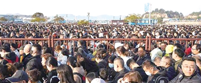 普陀山蜈蚣峙码头,人山人海,排队坐船去普陀山的游客人挨着人,一眼望不到尽头。