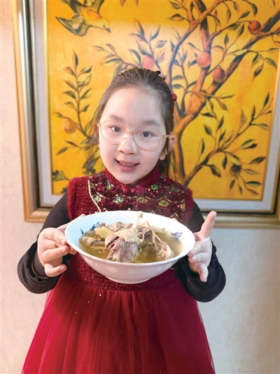 杭州市观成武林小学一(11)班的蔡艺宁,这个寒假最开心的事,就是回到妈妈的家乡浙江仙居,品尝家乡的味道。一回到家,外婆就在厨房忙碌,慢火炖着家乡特色老鸭汤,她说:“这汤要选取本地最纯正的土鸭,慢火炖足三个钟头,才够暖,才够香。”外公则在一旁帮着切姜片,笑着说:“这是给我的小宝贝准备的‘爱心汤’。”
