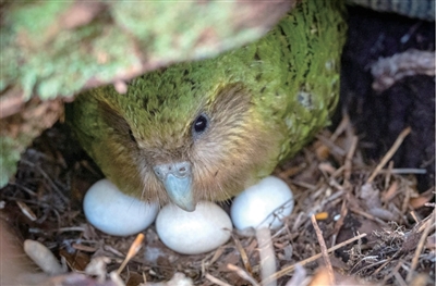 今年1月以来,一些鸮鹦鹉的爱好者们通过直播,展示了23岁鸟妈妈“雷奇欧拉”的繁殖过程。它一共产下三颗蛋,其中两颗受精。由于鸮鹦鹉的蛋太过稀有,工作人员用假蛋换出了真蛋,放在人工温室中培育,直到蛋快要孵化前,才放回鸟巢。2月24日,“雷奇欧拉”的第一个宝宝就这样孵化了。新西兰人预计,今年2月可能会迎来鸮鹦鹉的一波生育小高潮。