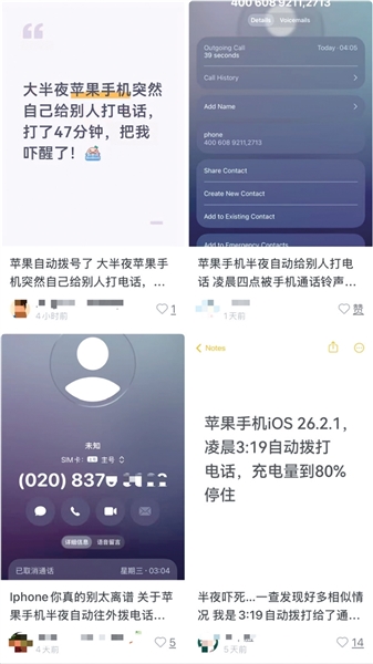记者查询发现,去年11月就有多名用户在社交平台反映,更新iPhone手机至iOS26.0.1版本后,手机在锁屏状态下半夜自动拨打电话给陌生人,被呼叫对象包括快递员、商家客服等。部分未更新至最新系统的老款iPhone也出现了类似问题。