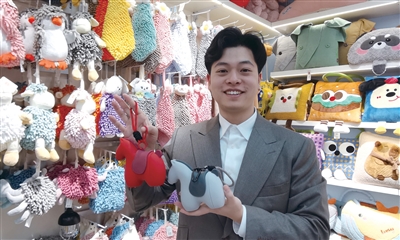 在“秋叶玩造”店铺内,负责人成胜忙着摆放产品,这是一家经营潮玩的店铺,“星际熊”“宙月兔”系列的产品让人应接不暇,可谁能想到他此前经营了8年的百货用品。