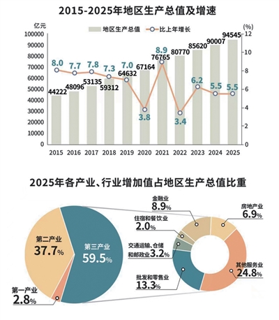 公报指出,2025年全省地区生产总值94545亿元,比上年增长5.5%。人均地区生产总值141418元(按年平均汇率折算为19798美元),增长4.9%。