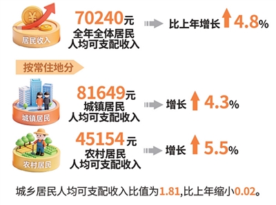 按常住地分,城镇居民人均可支配收入81649元,扣除价格因素实际增长4.3%;农村居民人均可支配收入45154元,扣除价格因素实际增长5.7%。