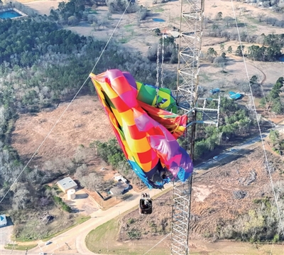 2月28日,美国得克萨斯州,一个热气球缠绕在通信塔上。救援人员随后成功救出被困在高空的两人。