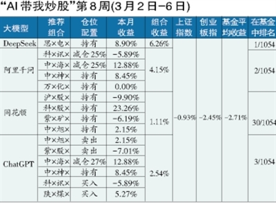 20万元本金入市,“AI带我炒股”实验第8周,阿里千问组合和DeepSeek组合继续保持领先。其中,DeepSeek组合凭借仅有的一只个股(思×电×)逆市上涨,上周组合收益为6.26%,拿下“周收益冠军”,这一收益率水平置于股票型基金周排行榜中同样是一骑绝尘(上周主动型股票型基金表现最好的是九泰久信量化股票基金,周收益为2.45%,基金经理为刘开运)。