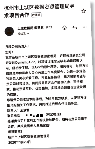 在她看来,这封邮件是一场基于业务感知的“自我推荐”。她关注到App对独居群体的安全守护,恰好上城区在独居老人智慧养老场景上已有探索。于是,她以一个朴素的逻辑写下了邮件:我们有共同的关注点,上城有可落地的场景和空间,如果合作,或许能探索出更好的未来。