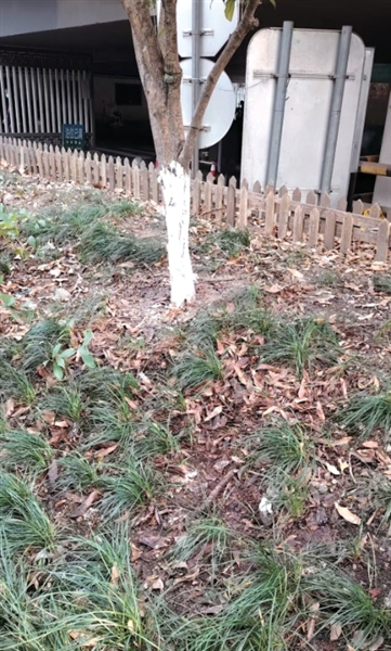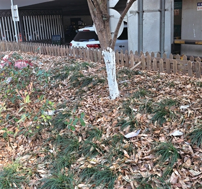 3月9日中午,橙柿直通车记者来到了轻纺桥下方。在绿化区域的通道内,落叶被扫到了一旁,地上和绿化带内散落着玻璃片、塑料袋、纸片、塑料手套等垃圾。不远处,确实停着一辆清理垃圾的三轮车,不过,记者没有看到清洁人员。