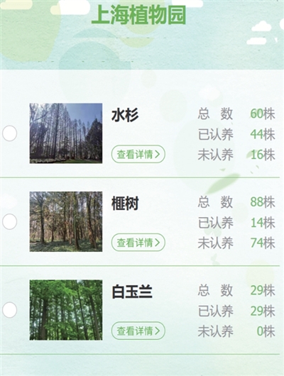 昨天11时,记者登录上海绿化认建认养平台,上海植物园29株白玉兰均已被认养,62株水杉已有超过三分之二被认养。