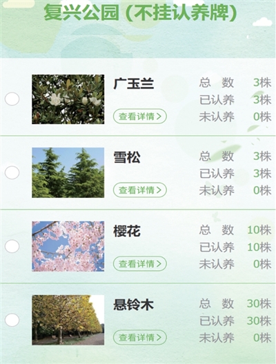 昨天11时10分,复兴公园67株开放认养的香樟、广玉兰、雪松、樱花、悬铃木全部显示“已认养”;延中绿地(卢湾段)仅剩4株杜英,其余100多株广玉兰、樱花、雪松、香樟都已被认养;徐汇区桂江路绿地的103株樱花只剩4株未被认养。