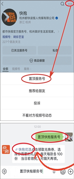 如何关注、置顶“快抱服务号”领好礼?
