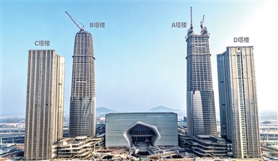 目前综合体各建筑正有序推进建设。除A塔楼外,B塔楼顶部正在进行钢结构安装;C、D塔楼外立面幕墙施工完成90%,室内装修与机电安装正在同步推进。
