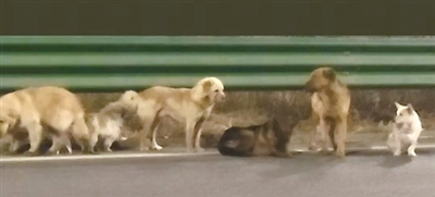 近日,吉林长春有网友拍到7只狗在长双快速路结伴而行。
