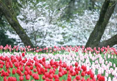 杭州太子湾,郁金香与樱花同框。记者 夏阳 摄