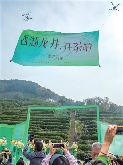 再次升空的无人机拉起一面巨型挂幅,上面写着“西湖龙井,开茶啦”字样,将开茶仪式推向高潮。