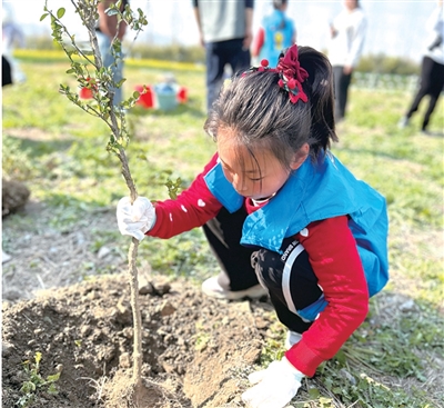 活动现场,小记者们变成小小园艺师,与家长分工协作、默契配合。孩子们挥锹挖坑、整平土地,再小心翼翼扶直树苗、捧土回填,小小的身影在泥土间忙碌,脸上沾着泥土也满是笑容。有的用小手把土块捏碎,有的蹲在树苗旁歪着头检查树苗“站姿”,还有的偷偷把捡来的小石子围在树根边,说是要给小树“建城堡”。家长们则化身技术指导,一边示范如何压实泥土,一边讲解:“树根要舒展开,才能吸收更多养分。”大家合力完成挖坑、扶苗、培土、踩实、浇水等每一步,动作认真又专注。
