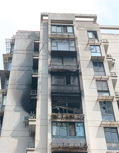 火灭之后,记者在现场看到10幢为2梯5户,失火这户北侧的客厅、厨房、卫生间的4扇窗户的玻璃全部破损。5楼、6楼雨篷顶均受损严重,4楼雨篷顶也有破洞,7楼往上西侧、北侧外立面被熏黑,8楼西侧的玻璃窗和雨篷均破损,整扇窗户一片漆黑。