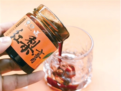 经过数十小时文火慢熬,每斤梨膏需耗费数斤红梨浓缩而成,膏体呈透亮琥珀色,质地浓稠细腻,滴落成丝。