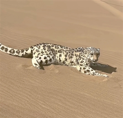 鄯善县林业和草原局草原站站长李红彪介绍,雪豹为高原珍稀物种,常年栖息于海拔2500米至5000米的高山裸岩区域,此次现身于库木塔格沙漠,属极为罕见的现象。“根据周边地理环境分析,这只雪豹极有可能是从天山山脉追逐猎物时迷路”。