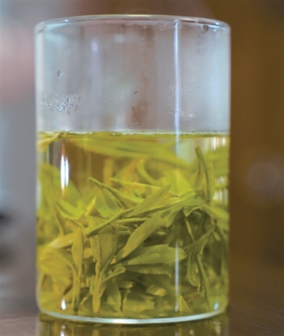 闻过茶香,继续注水泡茶,看着茶叶在杯中缓缓舒展,茶汤的颜色变得淡黄透亮,我再也忍不住开喝了。