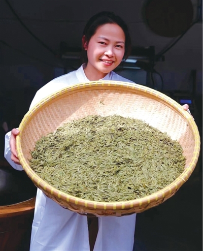 纯手工制茶的西湖龙井所费人力多,价格高昂,如今多采用机械制茶。而仇琴芳家则采用半手工制茶流程,先用机械杀青(通过高温破坏鲜叶的组织,使鲜叶内含物迅速转化,初步定型),而后进行手工辉锅(将回潮后的茶叶倒入锅中,进一步炒干成型)。