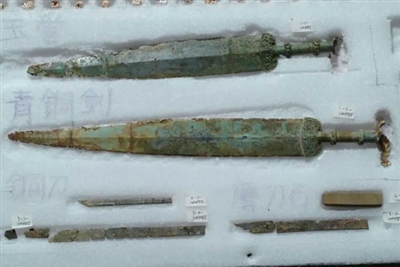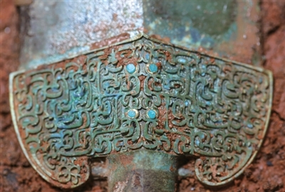 比如,出土的两把青铜剑均为厚格圆茎吴越式剑,剑身呈兰叶形、中起脊棱,剑格分别饰蟠虺纹与兽面纹,镶嵌绿松石,部分配有剑鞘和玉剑璏,为贵族佩剑。一柄通长43.4厘米,一柄长36.2厘米,刃部锋利,适配近身格斗。
