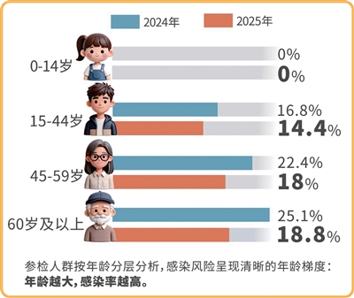 从数据来看,2024年、2025年,60岁及以上老年人群的阳性率在各年龄段中都是最高的,分别为25.1%和18.8%。