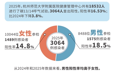 幽门螺杆菌筛查情况如何?我们请杭师大附院健康管理中心梳理了2024年和2025年两年数据:2024年,18467人做了碳13/14呼气试验,3763人查出阳性,阳性率20.38%。2025年,共18532人进行了碳13/14呼气试验,3064人查出阳性,阳性率16.53%。