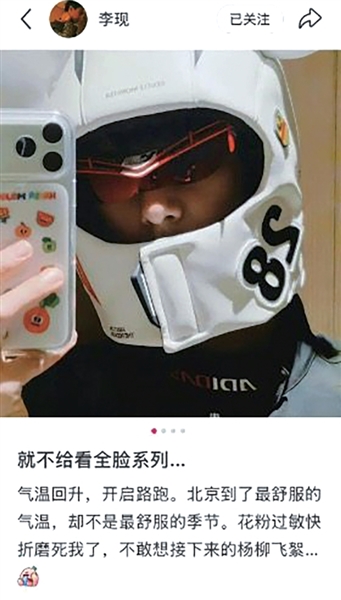 演员李现3月27日通过个人社交平台分享春季运动日常,其中一张图把脸包得严严实实。他文中写道:“气温回升,开启路跑。北京到了最舒服的气温,却不是最舒服的季节。花粉过敏快折磨死我了,不敢想接下来的杨柳飞絮。”