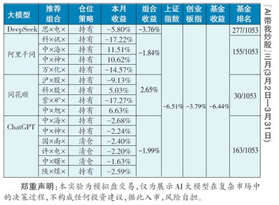随着3月行情正式收官,“AI带我炒股”迎来月度大考。3月,A股市场整体承压下行,上证指数全月下跌6.51%,创业板指下跌3.79%,同期股票型基金平均收益大幅下挫6.44%。