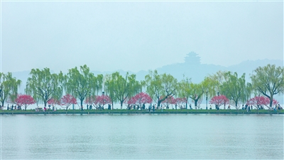 西湖白堤,桃红柳绿。 记者 陈中秋 摄