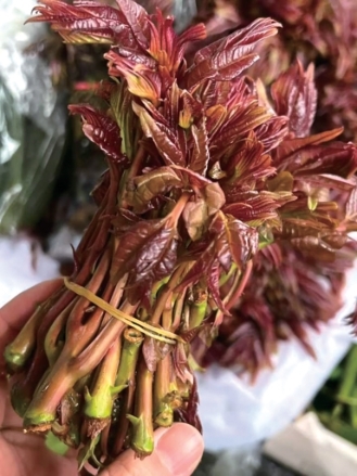 如果没找到“胡葱”,菜场里另一种炒蛋选手也到了性价比高的时候,就是香椿。