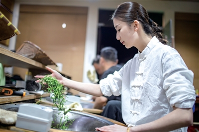 炒茶是门苦功夫,她从最基础的“杀青”学起,初次上阵,面对200多摄氏度高温的铁锅,她咬着牙,直至双手被烫出泡来。“我师父一开始不让我戴手套,说那样才能真切感知茶叶的变化。”