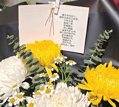 岳云墓前有人献花并手写小卡片 记者 刘抗摄