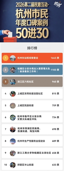 截至4月7日21时,杭州东站枢纽管委会“杭州东站绿皮小火车免费过夜”获得1643人次点赞,排名第一,钱塘区公安分局出入境管理大队(政务服务工作科)凭借“政务便民服务”获得1103人次点赞,排名第二。