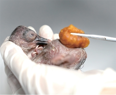 工作人员为朱鹮幼鸟消毒