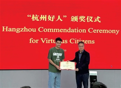 本报讯(记者 杨亦淇)4月10日下午,摩洛哥留学生AYOUB FADIL(中文名:尤博)获颁“杭州好人”荣誉证书,这也是“杭州好人”首次颁发给外国友人。