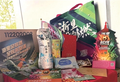 本场比赛观赛包基础物资包括助威服、助威棒、手摇旗、环保垃圾袋、卫生湿巾、软包装饮用水及备用雨衣。在此基础上,萧山区特别征集并配置了本土特色物品:萧山萝卜干、不二家饼干、萧山礼物抵价券、霸王茶姬优惠券、凯豪国际酒店代金券等,还有杭州市文商旅促消费宣传页、“吴越杯”球迷专享出行券包(飞猪)以及滴滴打车专享券等。