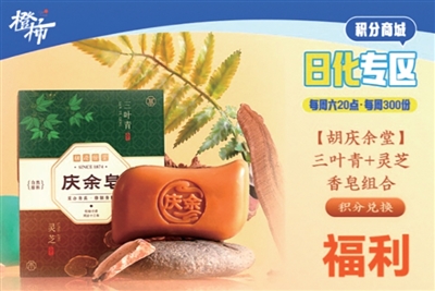 橙柿互动积分商城日化区4月上新啦,这次为大家准备的是胡庆余堂·庆余皂组合。500积分兑换一份,每份含三叶青香皂和灵芝香皂各一块,在规定时间内兑换,先到先得,换完为止。