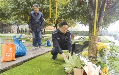 4月1日上午,欧阳清和趁着调休,约上护工张中林、公益律师朱政甫,来到鄞州区同泰嘉陵树葬广场,为老人扫墓。