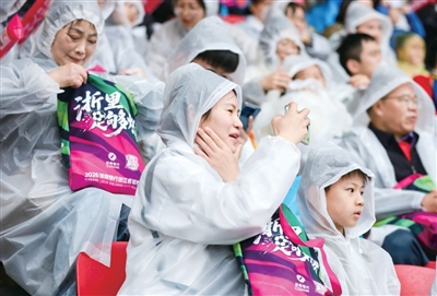 虽然下着雨,但球迷热情不减。杭州籍游泳奥运冠军孙杨携妻子张豆豆来到现场,为比赛开球。游泳亚运冠军吴越、浙BA冠军杭州队队员陈洋、多年支持青少年足球的餐馆老板江军昌等也到场观赛。