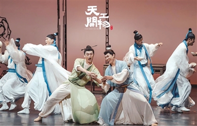 这部以《天工开物》为题材的舞剧,通过舞蹈、影像和现代科技的结合,以“赶考”“著书”“山河”等篇章为线索,通过舞蹈艺术让《天工开物》这部记录古代科技与工艺的百科全书“活”了起来,也呈现了“大明理工男”宋应星的“硬核”人生,观众仿佛穿越回了三百多年前,目睹宋应星如何在乱世中隐遁著书,以书为帆,将中国智慧传播四海。